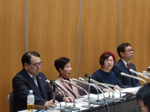抗議行動の後は法制審メンバーになっている委員が記者会見。左から村山浩昭弁護士、静岡から駆けつけた袴田ひで子さん、鴨志田祐美弁護士、そして田岡直博幹事。改悪に向かってひた走る法制審の現状が明らかにされました。しかし、ここで闘いを止めるわけにはいきません。引き続き総力を結集しましょう!!